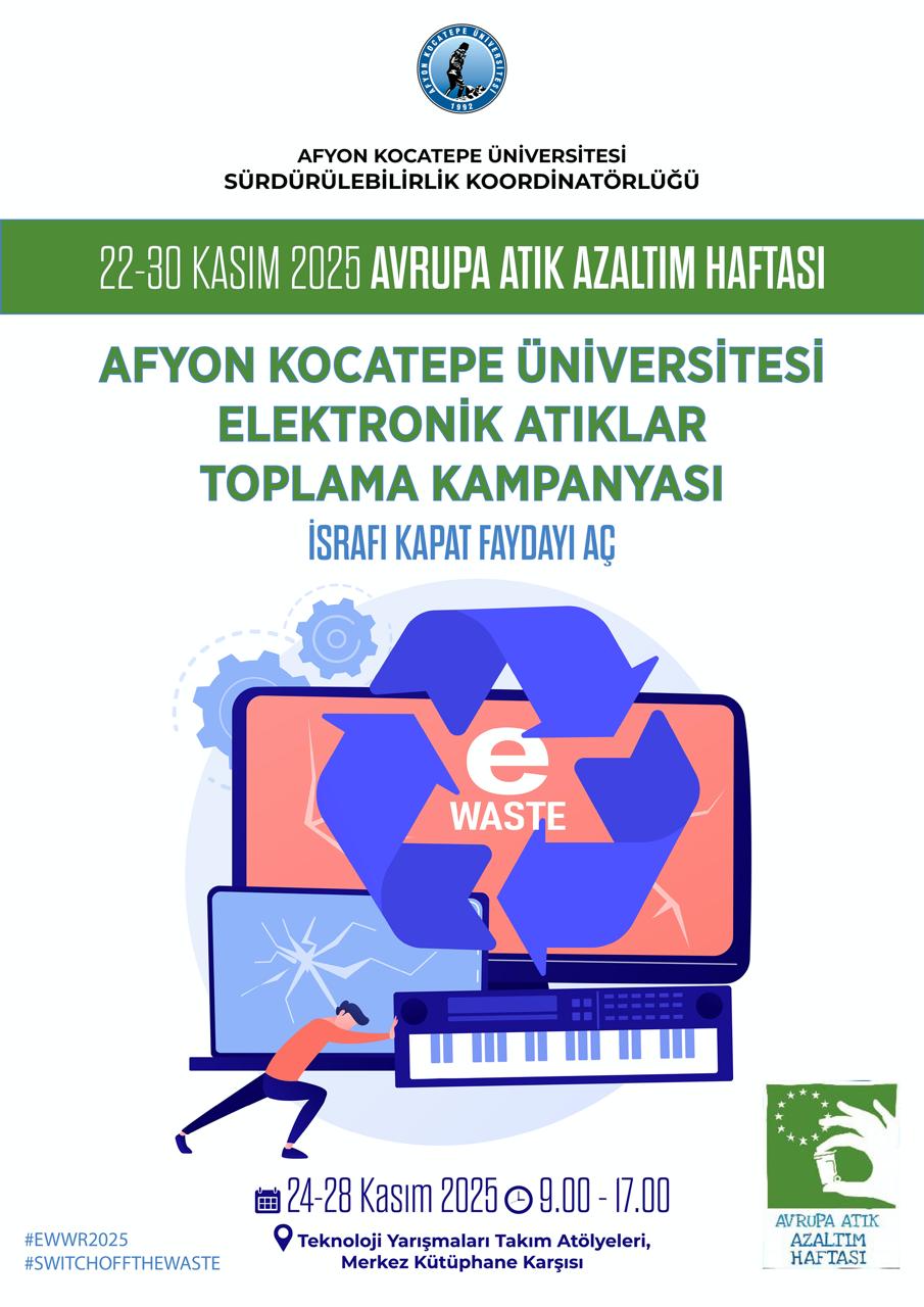 Avrupa Atık Azaltım Haftası (22-30 Kasım 2025) kapsamında üniversitemizde 24-28 Kasım 2025 tarihleri arasında elektronik atık toplama kampanyası düzenliyoruz.