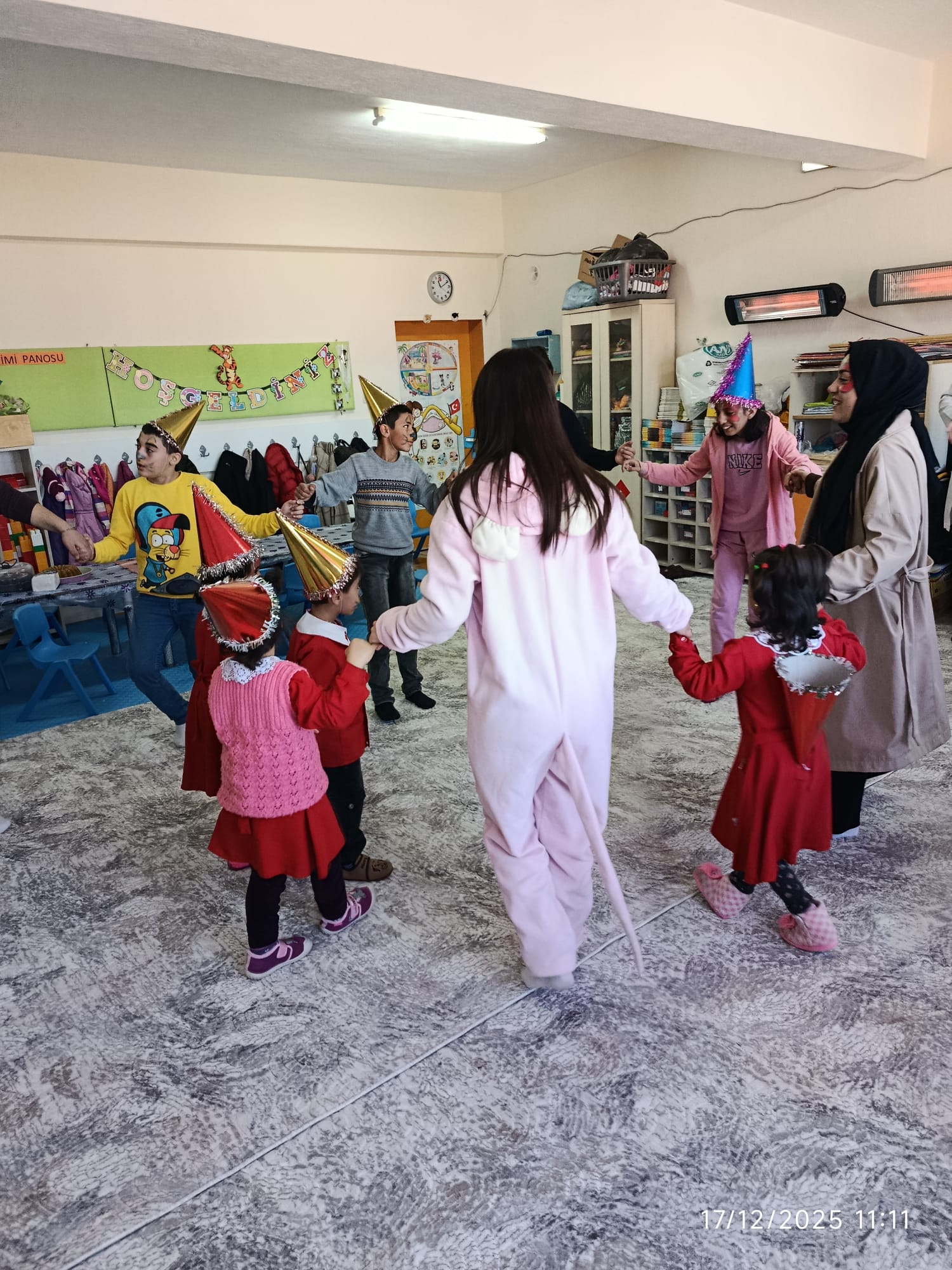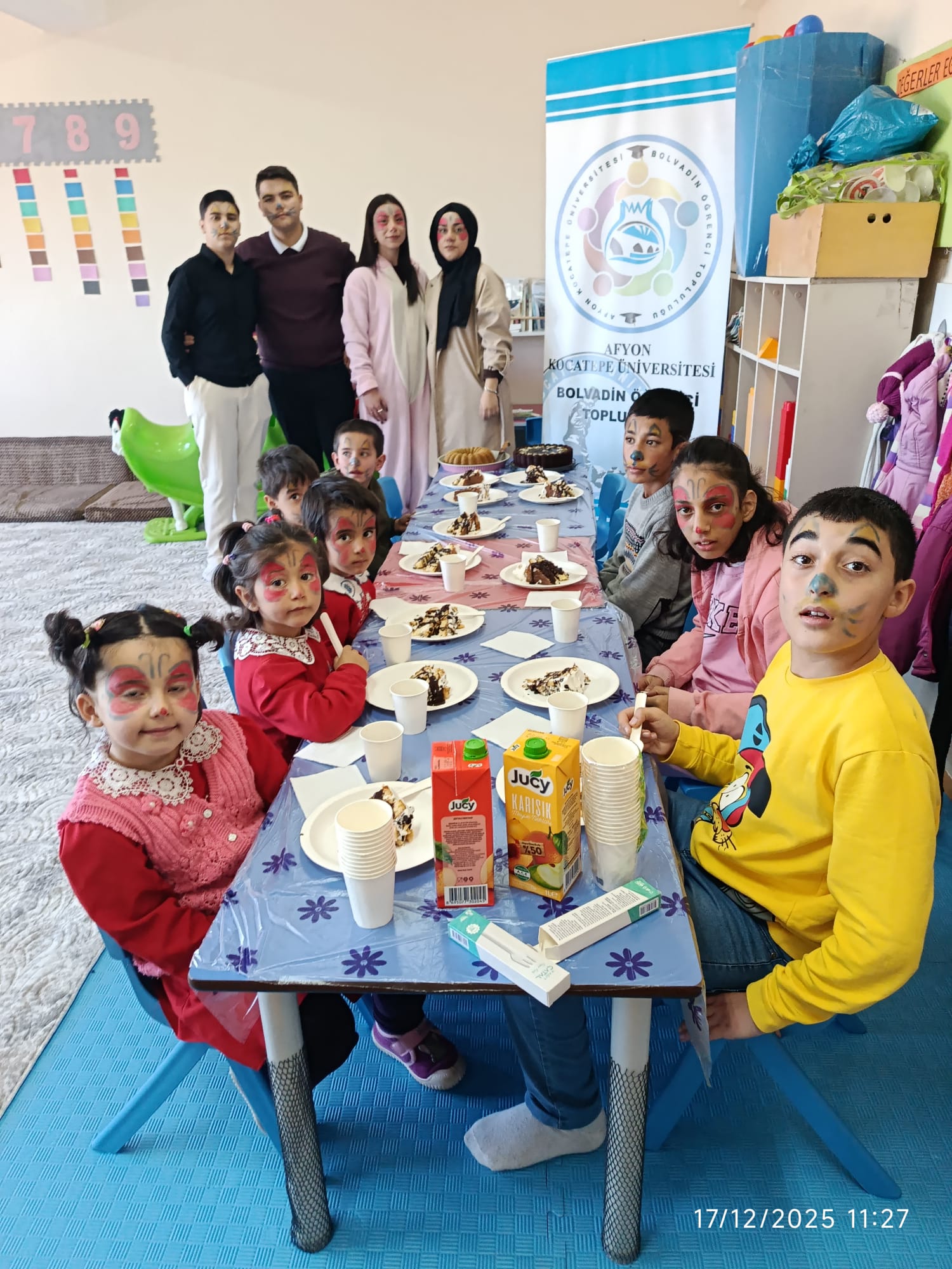 Bolvadin MYO Öğrenci Topluluğumuz tarafından, Bolvadin ilçemizdeki köy okullarındaki çocuklarımıza ulaşarak, gerek eğitim açısından gerekse sosyal gelişimleri açısından ihtiyaçlarını karşılamaya çalıştığımız “Çocuklar Gülsün Dünya Dönsün” etkinliğimizin üçüncüsünü Karayokuş köyü anaokulunda 17.12.2025 günü gerçekleştirdik. Etkinlik kapsamında; anılan köy okulunda eğitim gören (10) anaokulu ve (5) özel eğitim sınıfı öğrencimize yönelik, topluluk üyesi öğrencilerimiz tarafından yüz boyama, birçok çocuk oyununun oynattırılmasının yanı sıra, çocuklarımızla birlikte yaş pasta yaptık ve birlikte yedik. Anaokulu sınıfımızın önceki tarihlerde tespit ettiğimiz eğitim materyallerini öğretmenimize teslim ettik. Ayrıca çocuklarımıza sevdikleri masal kahramanları ile aynı karede tasarladığımız çerçeveli fotoğrafları, çeşitli boyama kitapları, çıkartmalı etiketler gibi bir takım hediyeler takdim ettik. Köy okullarındaki çocuklarımıza unutamayacakları bir gün yaşattık.