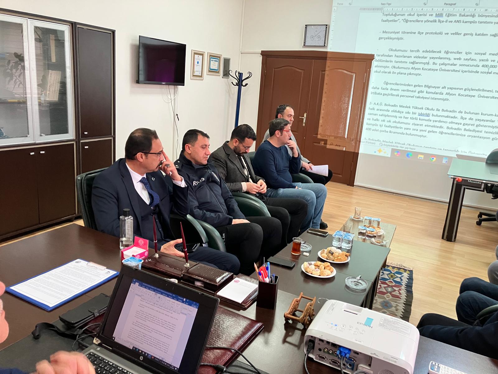 Toplantı Bolvadin Meslek Yüksekokulu Müdürü Prof. Dr. Hüseyin BAYRAKÇEKEN Başkanlığında, Yüksekokul Müdür Yardımcıları Dr. Öğretim Üyesi Fuat Öz ve Dr. Öğretim Üyesi Murat KESKİN, Doç.Dr.İsmail HOCAOĞLU Yüksekokul Sekreteri Mehmet Emin DEMİRÖRS, Dış Paydaşlarımız Belediye Başkan Yardımcısı Sadri BAYRAM, Bolvadin İlçe Emniyet Müdürü Kadir AVCI, KYK Müdürü Lütfi AYDOĞDU ve Bolvadin Gençlik Merkezi Müdürü Fehmi BAYTAROĞLU’nun katılımıyla gerçekleştirildi.
