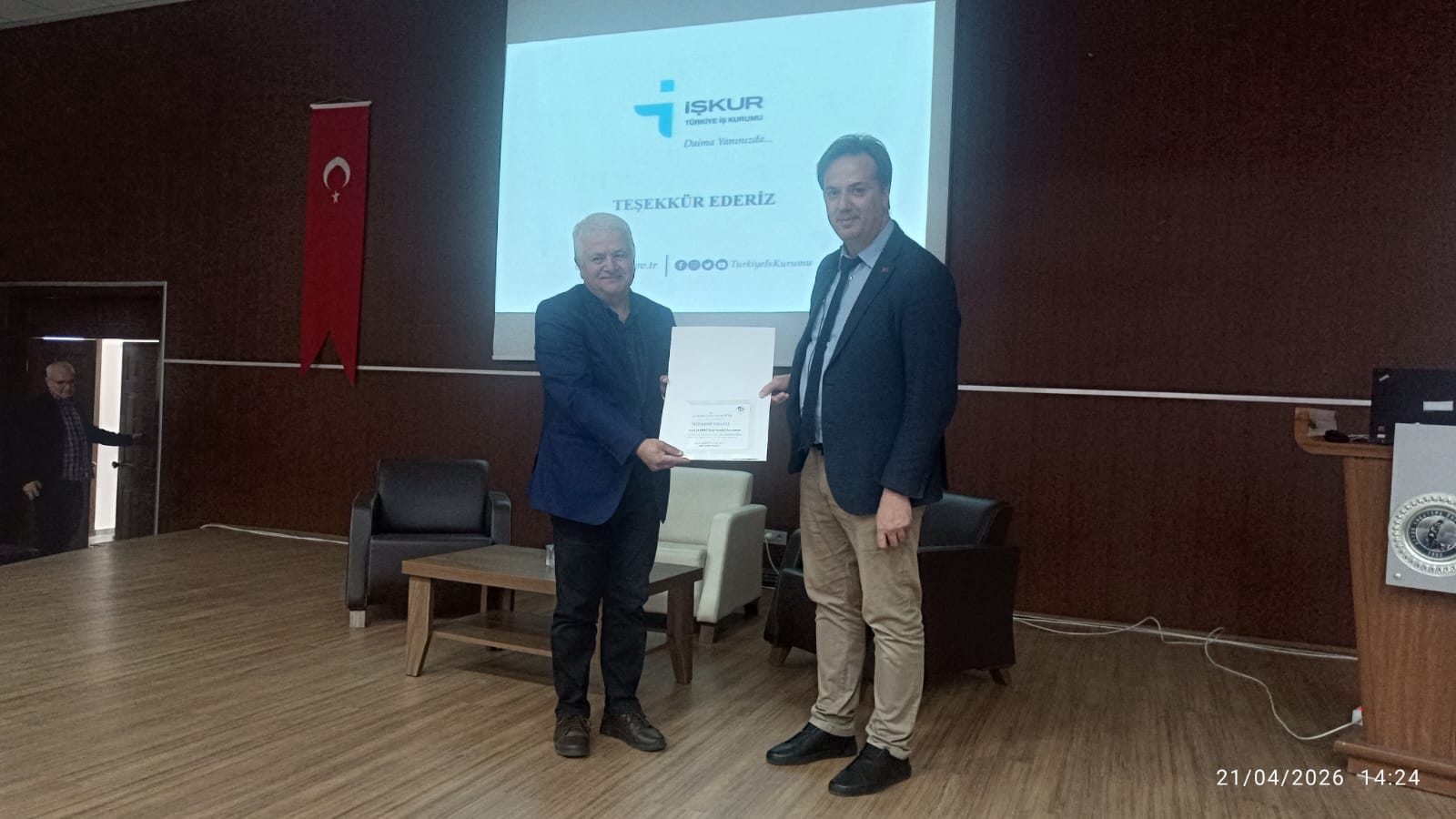Eğitim sonunda, Yüksekokulumuz Müdürü Prof. Dr. Hüseyin BAYRAKÇEKEN tarafından, eğitimi veren İş ve Meslek Danışmanı İhsan ALADAĞ’a teşekkür belgesi takdim edilmiştir.